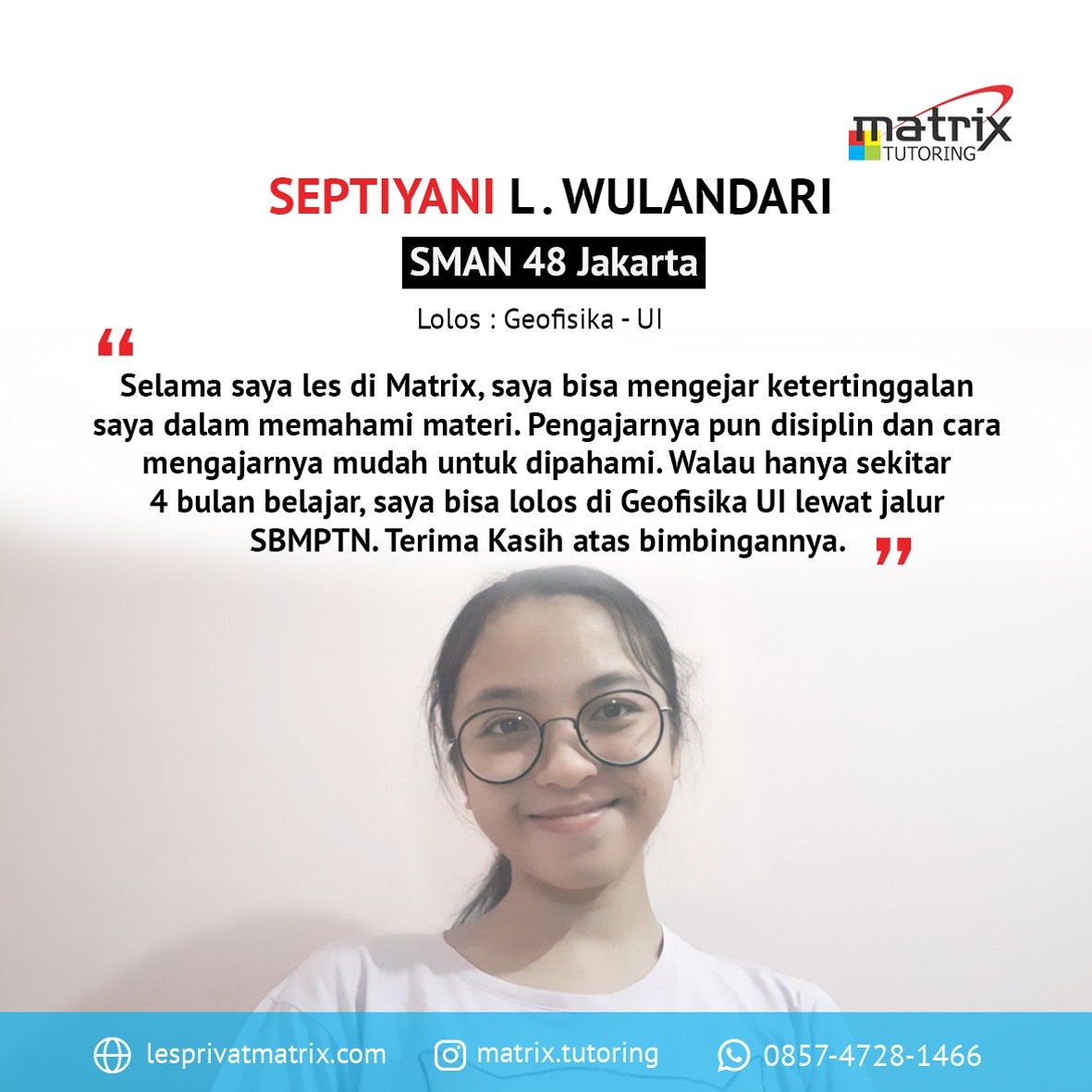 Pengajar Les Privat MATRIX adalah dosen, asisten dosen, guru, mahasiswa berprestasi dan alumni UI, UGM, ITB, IPB, STAN, STIS, UNJ, SSE, UIN dan berbagai Perguruan Tinggi terbaik lainnya yang telah memiliki pengalaman, diseleksi, dilatih dan diarahkan mengajar sesuai dengan spesialisasi dalam bidang ilmu yang dikuasai.